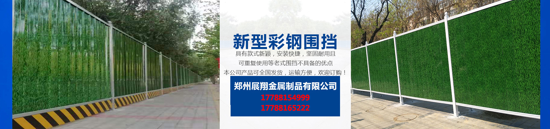 鄭州展翔金屬制品有限公司成立于2018年,公司專(zhuān)業(yè)從事市政設(shè)施的研發(fā)和生產(chǎn),經(jīng)過(guò)多年的積累和培養(yǎng),公司擁有一批經(jīng)驗(yàn)豐富的技術(shù)人才,公司主要生產(chǎn)新型市政圍擋、施工圍擋、彩鋼圍擋、工程圍擋、地鐵圍擋、PVC圍擋、及交通設(shè)施系列金屬產(chǎn)品,公司旗下的新型彩鋼圍擋、具有安裝方便,運(yùn)輸方便,拆裝方便,堅(jiān)固耐用,款式新穎,美觀大方、二次使用率高、無(wú)污染等優(yōu)點(diǎn)產(chǎn)品暢銷(xiāo)全國(guó)